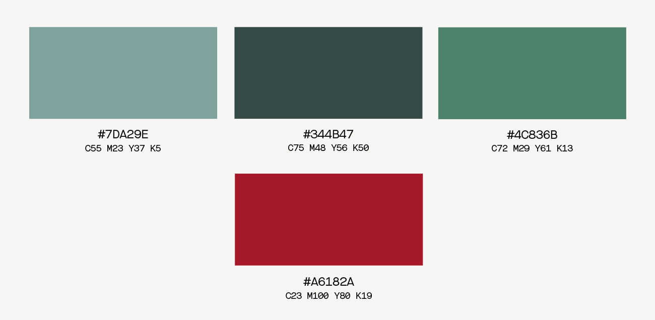 Vår huvudsakliga färgpalett består av tre gröna färger. Vår röda färg är vår varumärkesfärg och måste användas med försiktighet. Den används främst i logotypen men kan även användas i andra grafiska element om den används sparsamt.